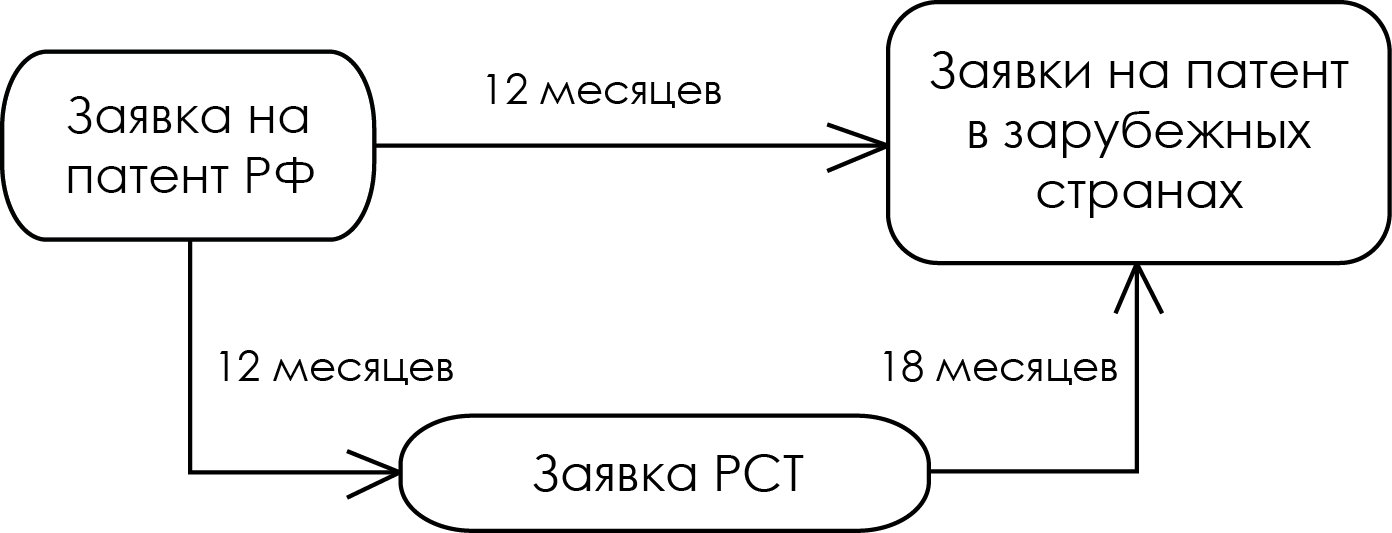 - В течение 12 месяцев с даты подачи заявки на патент в РФ, необходимо подать заявки на патент в зарубежные страны или оформить заявку РСТ.
