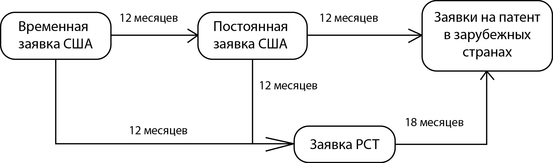 - Регистрация, в течение 12 месяцев, постоянной заявки в США либо заявки РСТ.
